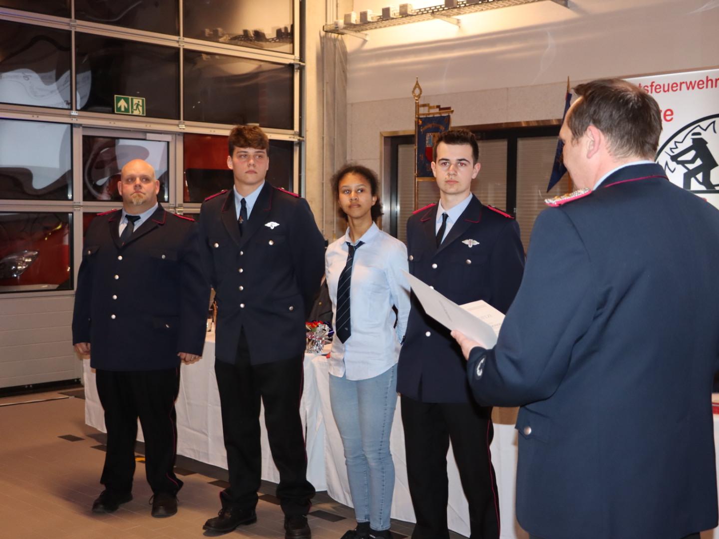 Im Mittelpunkt der Versammlung standen zahlreiche Ehrungen und Ernennungen. Zur Feuerwehrfrau beziehungsweise zum Feuerwehrmann wurden Josephine Hodonou, Jonas Blanke, Max Kerstan, Rodrigo Kläger und Thomas Fink ernannt. Den Dienstgrad Oberfeuerwehrfrau beziehungsweise Oberfeuerwehrmann erhielten Finja Behr, Maarten Behr und Aaron Schernich.